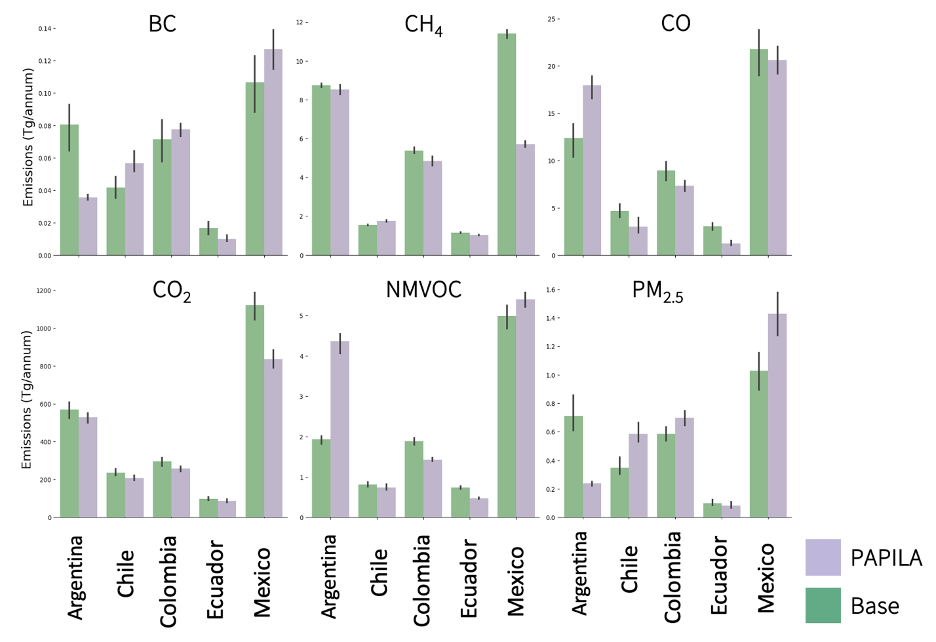 The main contribution is the PAPILAv2 regional emission inventory for South America covering the period 2014 – 2020. This is a high-resolution local emission inventory combined with global emission inventories through a mosaic approach. PAPILAv2 expands on its predecessor by incorporating greenhouse gases (CO2, CH4) and particulate matter (PM10, PM2.5, BC, OC) in addition to reactive gases (CO, NOx, NMVOC, NH3, SO2). It uses the CAMS-GLOB-ANT v6.1 inventory as its baseline, supplemented by the EDGAR v6.1 and GFAS datasets for particulate matter and biomass burning emissions, respectively. High-resolution local data from Argentina, Chile, Colombia, Mexico, and Ecuador were integrated ensuring consistency with CAMS’s 0.1° grid resolution. A forthcoming paper will detail the methodology, present key regional characteristics, and compare PAPILA v2.0 with other global and regional inventories, highlighting the improvements achieved through the mosaic approach.